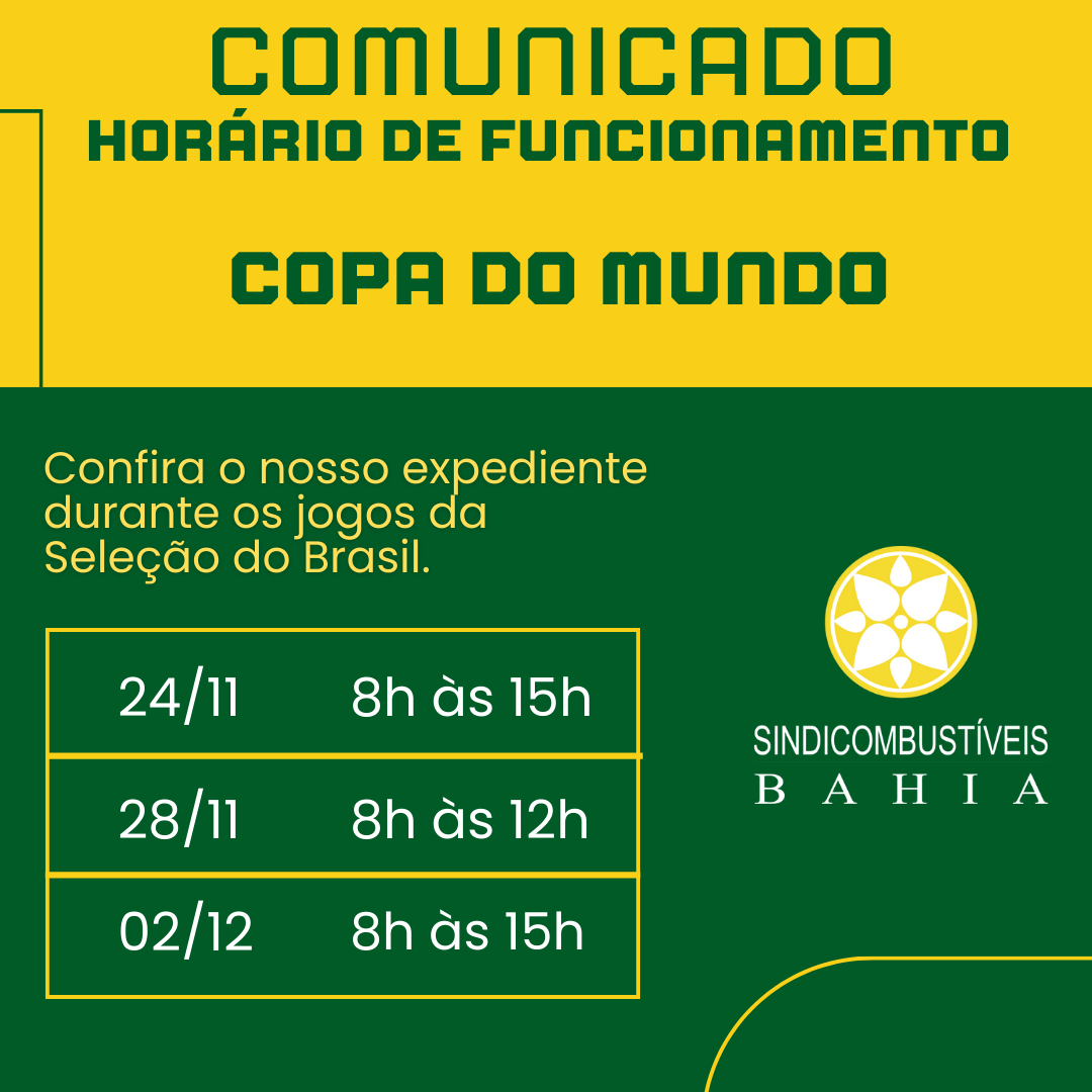 Com a realização do primeiro jogo da Seleção do Brasil nesta quinta-feira (24), confira como será o expediente no Sindicombustíveis Bahia durante os jogos da Seleção Brasileira na primeira fase da Copa do Mundo.