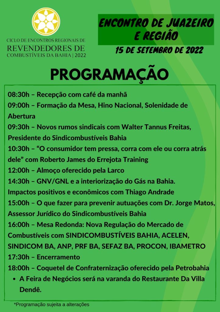 O Encontro de Juazeiro e Região, inicia a partir das 8:30 horas, tem o patrocinío da Acelen, Bahiagas, Larco, Petrobahia, WebPosto, Hora Equipamentos, Xpert, Ecopostos, Dislub e Paep.