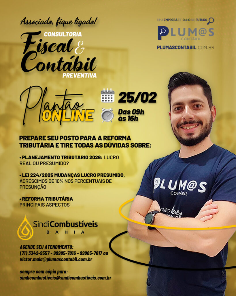 Com a parceria da Plumas Contábil, empresa que atua há mais de 40 anos com postos de combustíveis, o Sindicombustíveis Bahia irá realizar mais um Plantão de Atendimento Fiscal e Contábil gratuito para os associados.