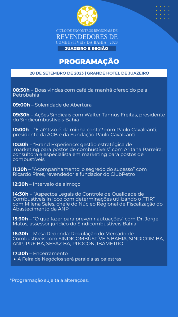 No Encontro de Juazeiro, o mercado de combustíveis, as regras que regulamentam o setor, serão discutidos numa mesa de debate com a participação dos órgãos de fiscalização, Sindicombustíveis Bahia e Sindicom Bahia, todos os agentes envolvidos no setor de combustíveis.