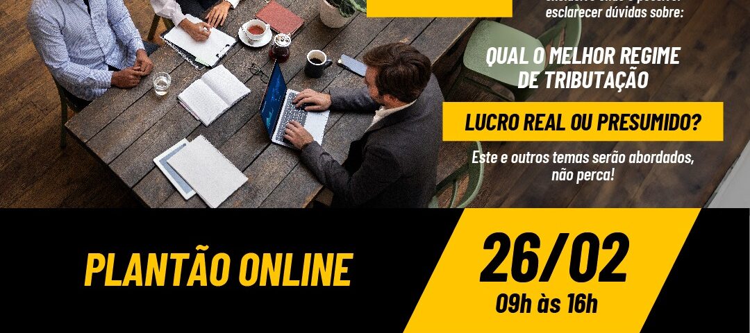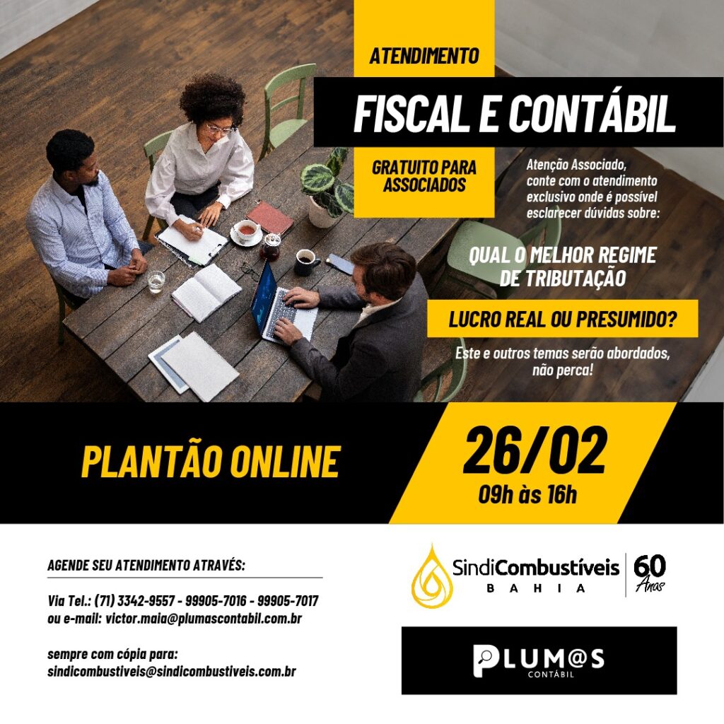 A Plumas Contábil, parceira do Sindicombustíveis Bahia, vai realizar o Plantão Fiscal e Contábil no dia 26 de fevereiro, próxima segunda, e será on line. Assim, todos terão oportunidade de participar!