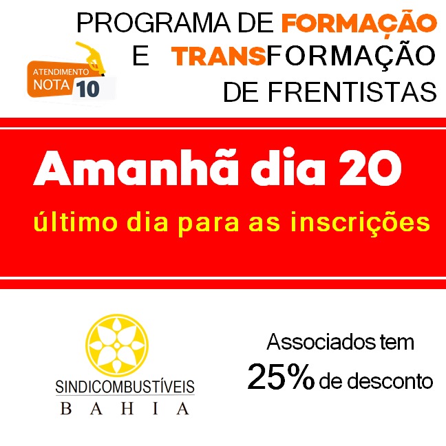 As inscrições vão até esta terça – dia 20/10 – e os associados do Sindicombustíveis Bahia têm 25% de desconto.