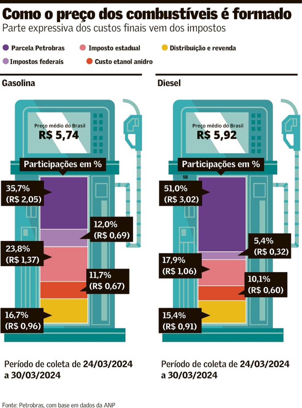 Para a fonte, que participou das discussões sobre o ICMS, a medida é favorável e deixa o imposto mais previsível. Em 2024, o ICMS sobre a gasolina está em R$ 1,37 por litro e sobre o diesel, em R$ 1,06 por litro. O imposto federal sobre a gasolina é formado por Contribuição de Intervenção no Domínio Econômico (Cide), Programa de Integração Social e o Programa de Formação do Patrimônio do Servidor Público (PIS/Pasep) e Contribuição para o Financiamento da Seguridade Social (Cofins).